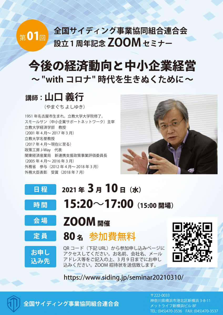 そこで、今回、山口義行氏を講師にお迎えし、今後の経済動向の見通しと中小企業経営について貴重なお話を伺います。