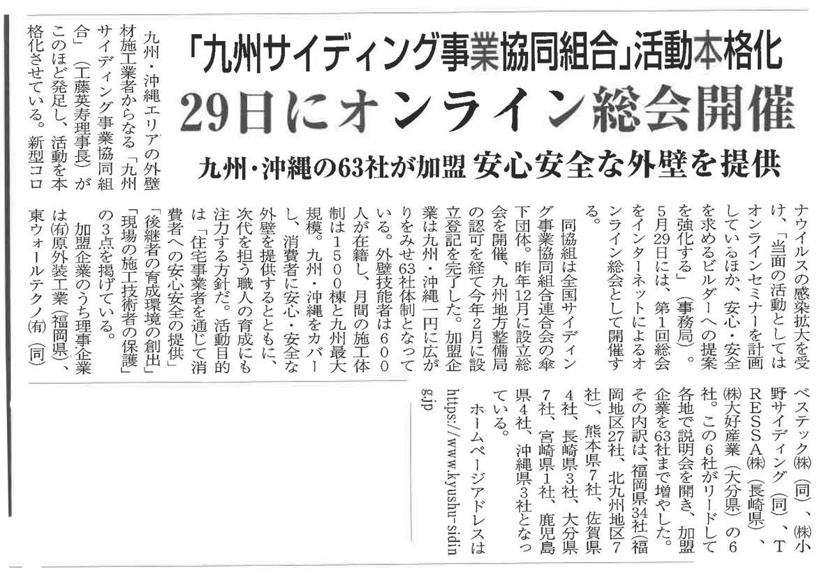 2020年05月23日 フクニチ住宅新聞 記事掲載 5月22日のフクニチ住宅新聞に 当団体の記事が掲載されました。 先日の日刊材木新聞に続き、活動の後押しになる記事掲載です。 引き続き皆様どうぞよろしくお願い致します。