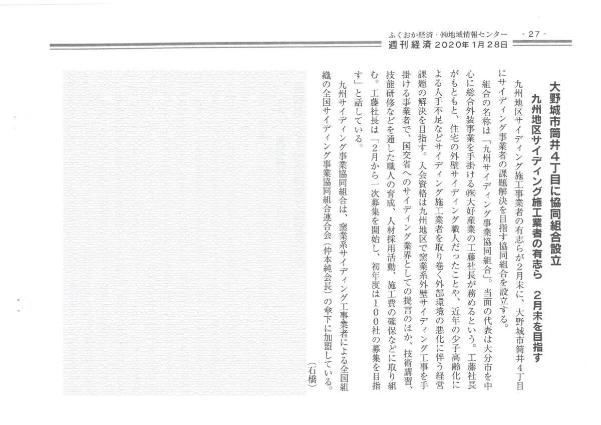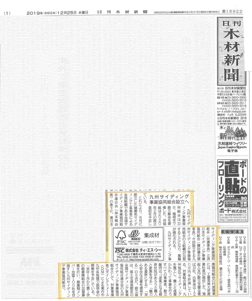 2020年02月01日 ふくおか経済・日刊木材新聞にとりあげていただきました 昨年末に「日刊木材新聞」 先月末に「ふくおか経済」にて組合設立を取り上げていだだきました。 詳細の記事は添付の資料をご覧ください。